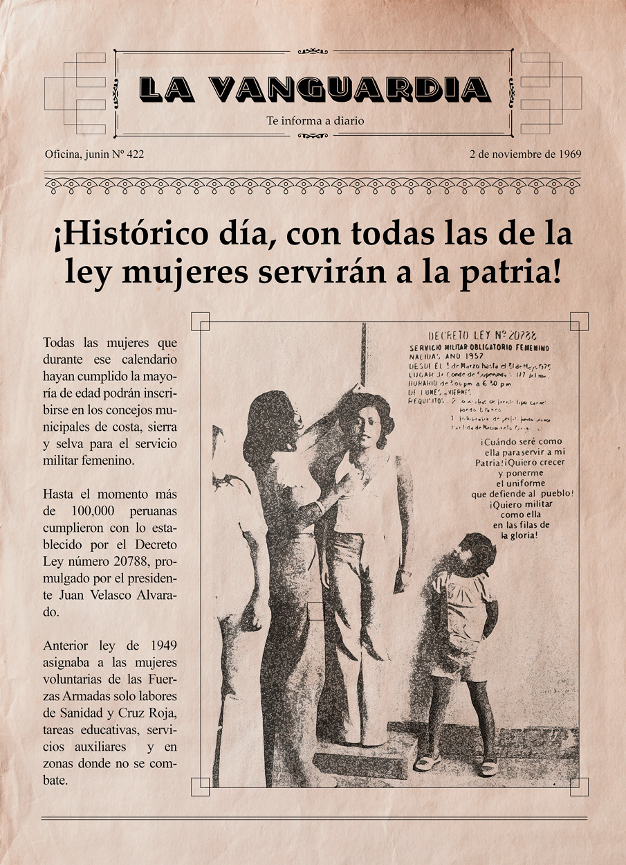 Los archivos que integran esta colección visibilizan el ingreso de las mujeres a las Fuerzas del Orden y de la Seguridad, espacios de los que estuvieron relegadas hasta la primera mitad del siglo XX. Las portadas que constituyen este rubro visibilizan avances en la igualdad de género a nivel de política pública e institucional, es así que se recogen los diarios que da cobertura al ingreso de las mujeres a la Policía de Investigaciones, las primeras paracaidistas reservistas, así como hitos en la legislatura peruana como el decreto que les permite a las mujeres realizar el Servicio Militar.